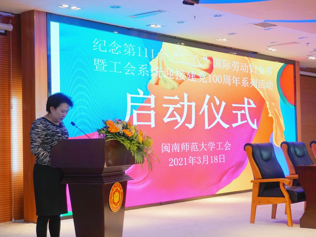 3月18日下午,我校在逸夫楼图书馆五楼报告厅举行纪念第111个“三八”国际劳动妇女节暨工会系统迎接建党100周年系列活动启动仪式,校党委常委、副校长、工会主席蒋一婷出席并致辞。仪式由校工会常务副主席陈惠卿主持。校工会女工委委员、各二级工会女工会主席及部分女教职工代表参加活动。